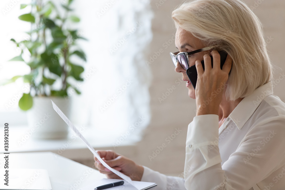Serious 60 years old businesswoman talking on smartphone and reading document, solving corporate business problem. Female employee discussing document by cellphone, receive news.