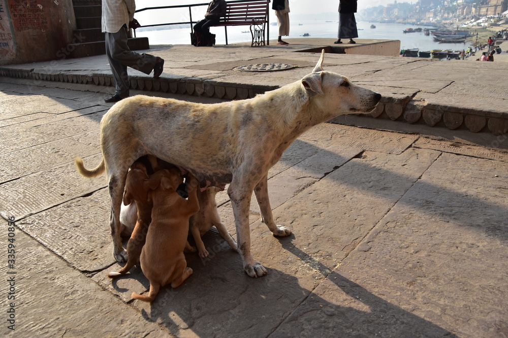 インドの世界遺産のワラーナシー ガンジス川沿いのガートで生活する野良犬の親子 母乳を飲む子犬の群れ 子育てをして授乳をする母犬