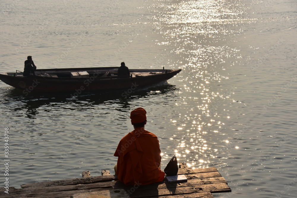 インドの世界遺産のワラーナシー ガンジス川沿いのガートで瞑想するヒンドゥー教の巡礼者 美しい朝日と川を進む遊覧ボート