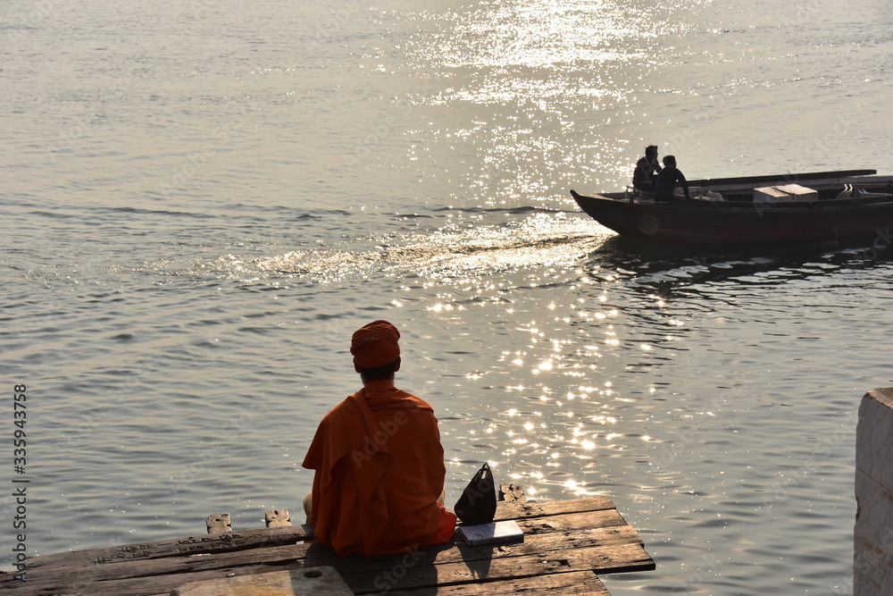 インドの世界遺産のワラーナシー ガンジス川沿いのガートで瞑想するヒンドゥー教の巡礼者 美しい朝日と川を進む遊覧ボート