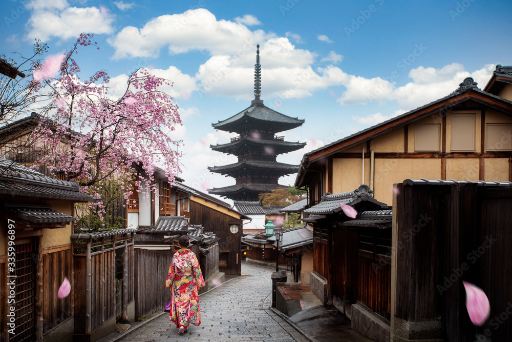 Asian woman wearing japanese traditional kimono at Yasaka Pagoda