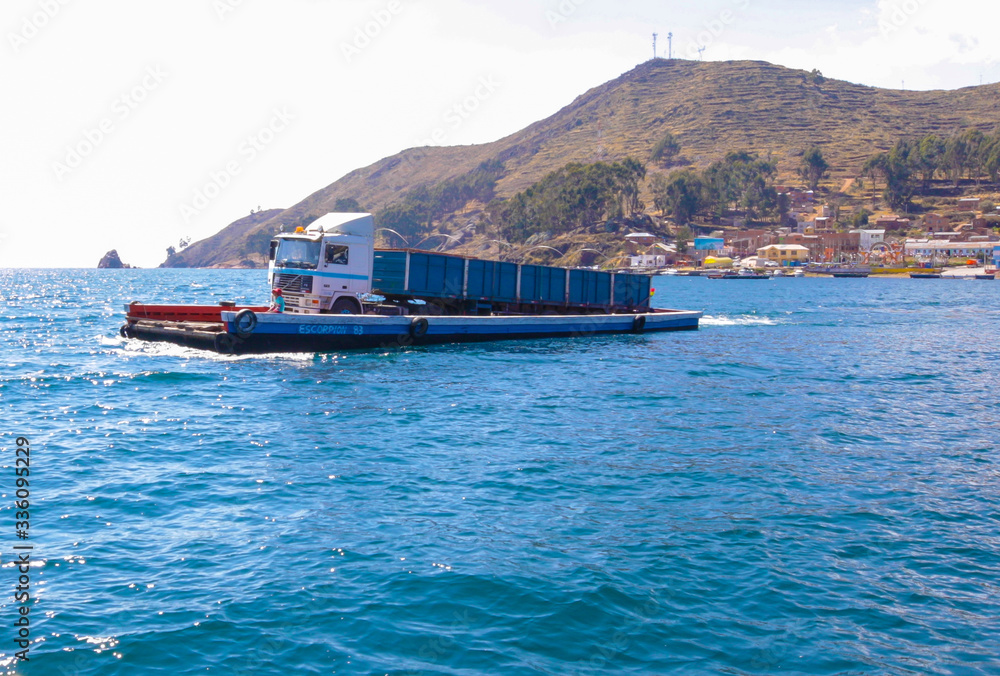 Bolivia Titicaca lake wooden ferry with trucks on board