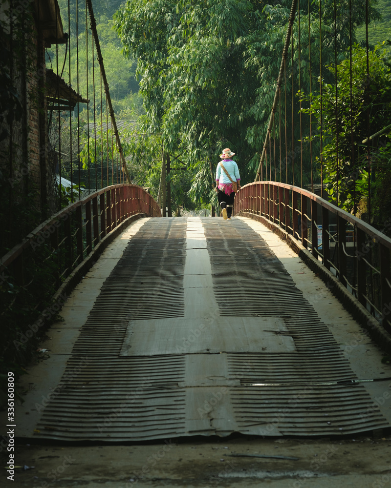 Woman walking on a bridge in the mountains in \sapa, Vietnam