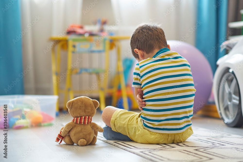 sad boy sits on the floor of the nursery. lonely kid misses home