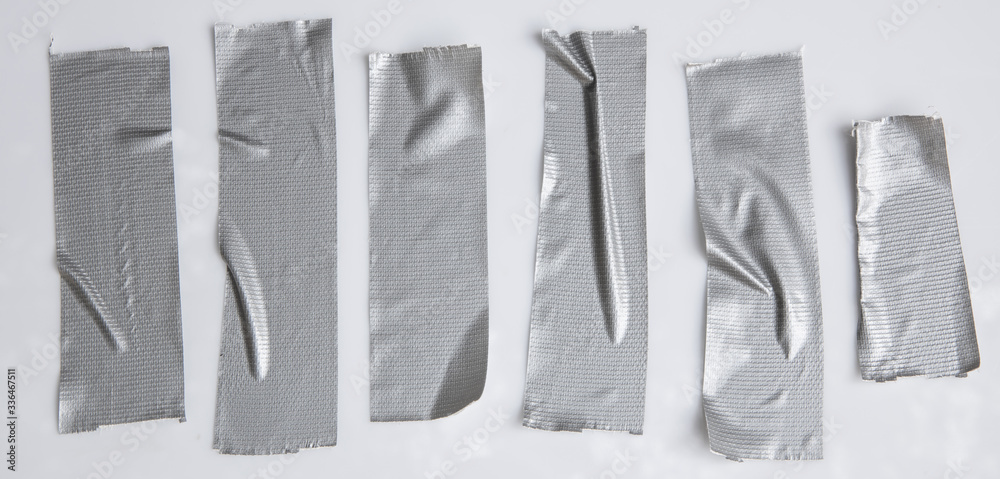 Set of gray tapes on white background. Torn horizontal and different size sticky tape, adhesive pieces.