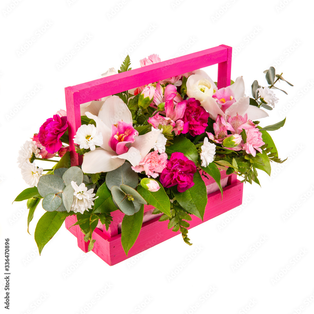 Orchids in bouquet in wooden pink stand with green leaves and greens