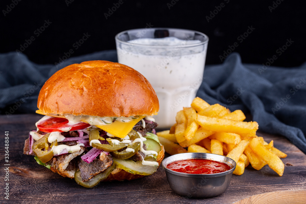 Hamburger meat with beef, ketchup, fries and glass with kefir 3724 Hamburger meat with beef, ketchup, fresh salad and glass with kefir