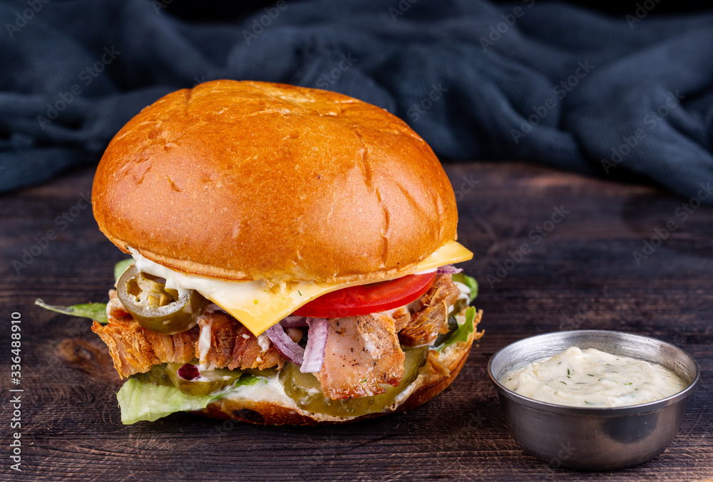 Hamburger with pork, cheese, tomatoes, pepper and pickles with sour cream sauce