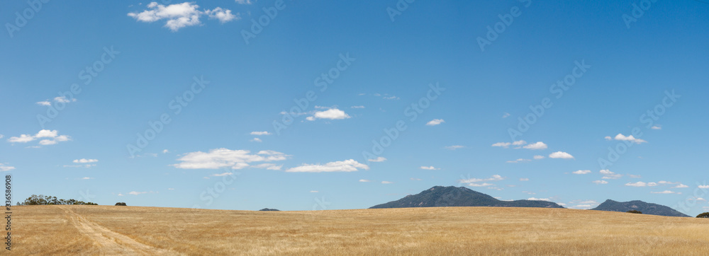 panorama of recently harvested farm fields with the Grampians mountains rising in the distance on the horizon, rural Victoria, Australia