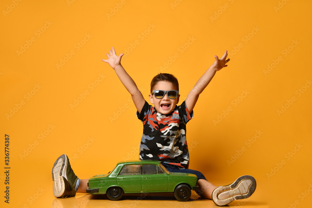 Child in sunglasses, camouflage t-shirt. Raised hands, sitting on floor near green model of retro car, posing on orange background