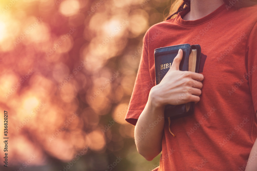 Girl holding a Bible tight as it is the only hope, beautiful warm color palette