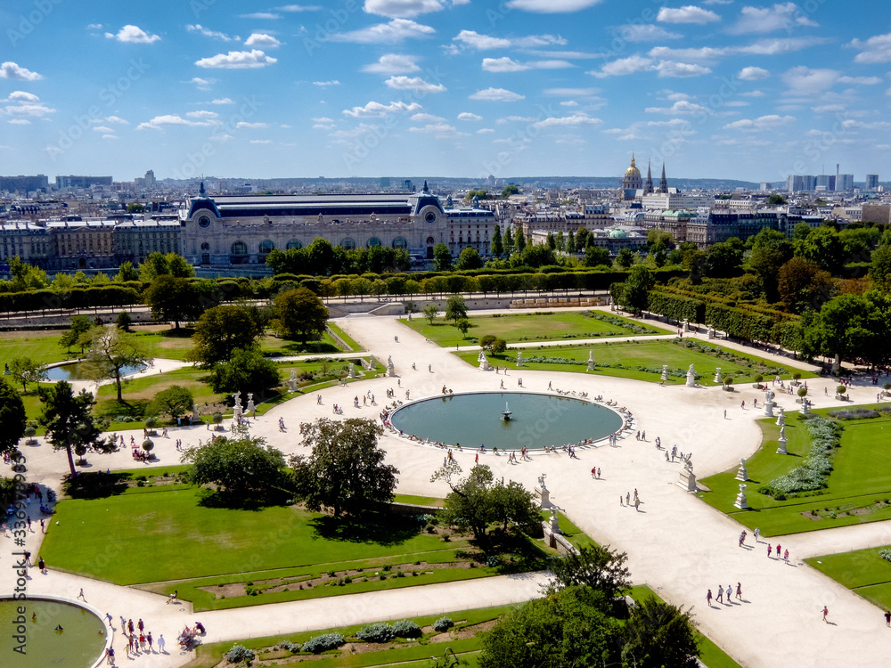 Louvre Palace Museum and green garden with fountain in Paris, view from above