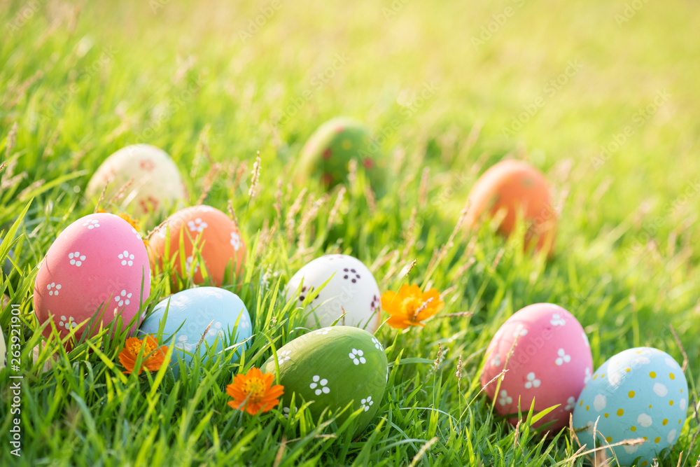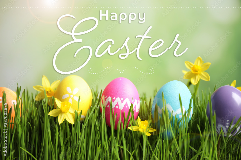 Colorful eggs and daffodil flowers in green grass and text Happy Easter on blurred background