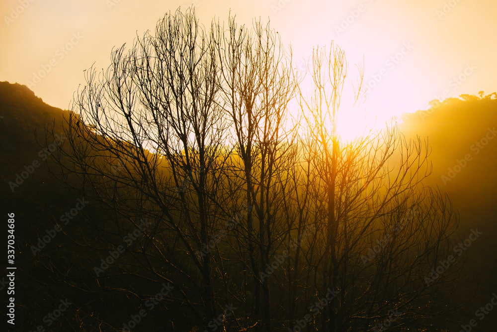 Sunrise time with bare or dry tree hill or mountain in forest with light of sunrise on the background.