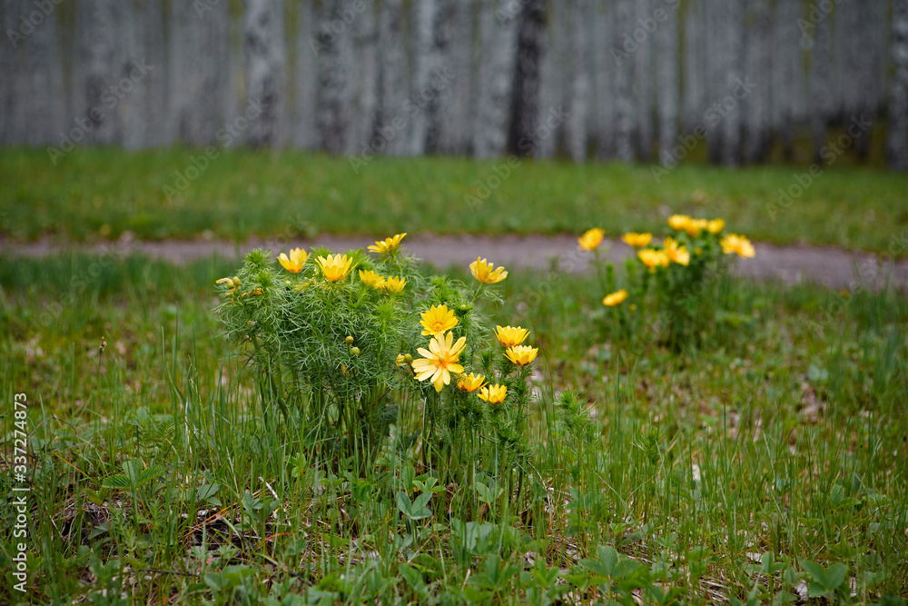 Wild spring bright yellow flower Adonis vernalis in the glades of the birch forest