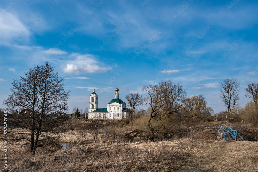 Spring rural landscape with a white-stone church in the village of Sidorovskoye, Ivanovo Region.