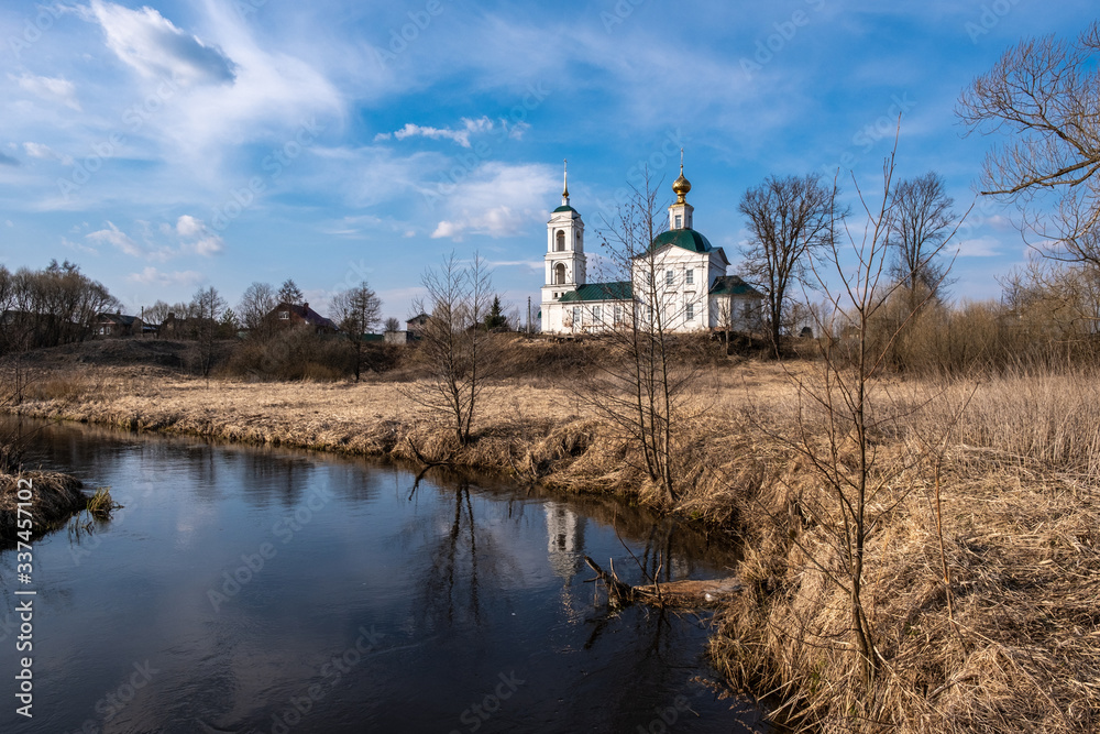 Spring rural landscape with a white-stone church in the village of Sidorovskoye, Ivanovo Region.