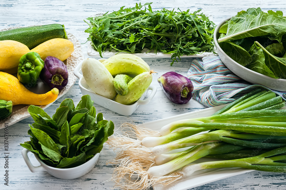 Fresh tabletop scene of just harvested arugula, chard, cucumbers, peppers, squash, zucchini, onions and sorrel.