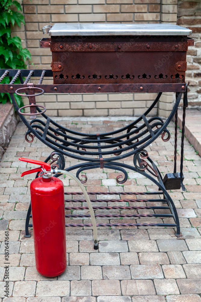 Red fire extinguisher stands in front of metal barbecue