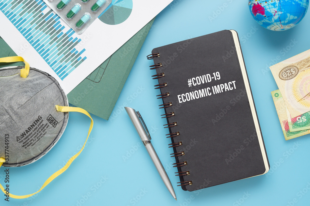 COVID-19 or Corona virus Economic IMPACT background concept. Mockup Notebook for Covid 19 Economic impact anlysis with busines graphs sheets, N95 facial masks, bank notes on blue working desk.