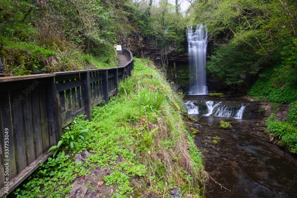 Wanderweg mit Geländer und Wasserfall vor Felsen in Irland