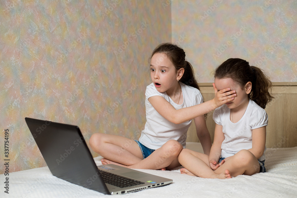 Little girl protects his sister from watching inappropriate content while using a computer. Internet safety for kids concept.