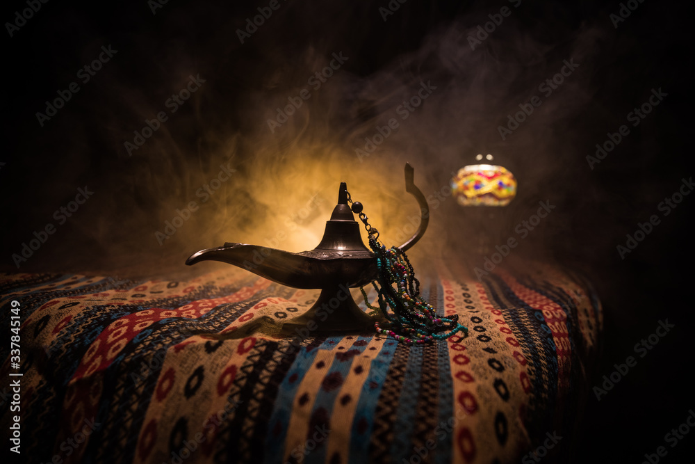 Lamp of wishes concept. Antique Aladdin arabian nights genie style oil lamp with soft light white smoke, Dark background.