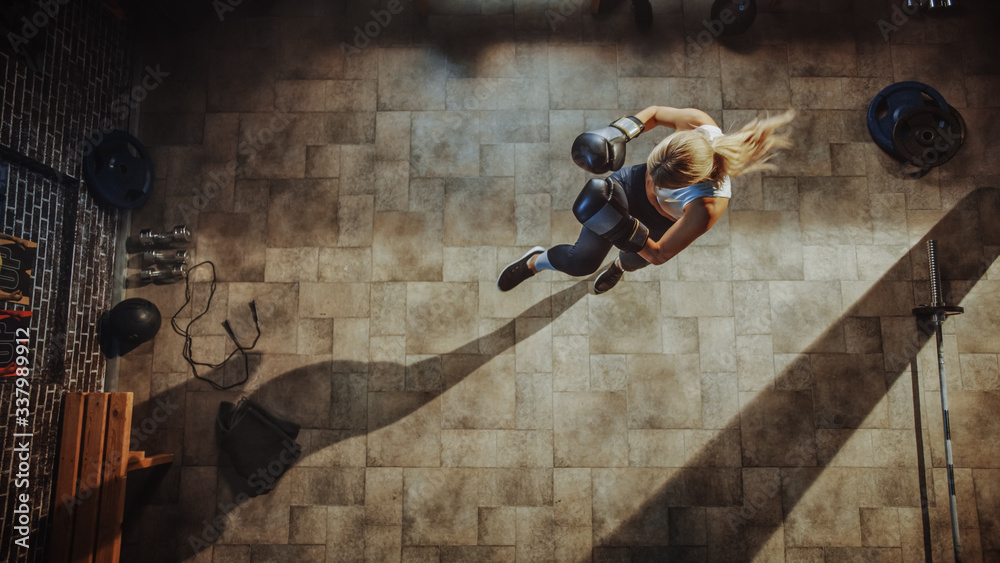 Professional Female Fighter Exercises Kicking and Punching Air while Wearing Sportswear and Fighting Gloves in the Hardcore Gym. Strong Beautiful Girl Kickboxing and Self Defense Workout. Top View