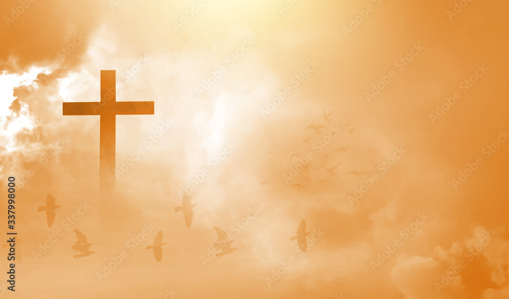 The Christian cross looks bright in the golden sky, with soft white clouds and beautiful light which leads to peace and heaven.