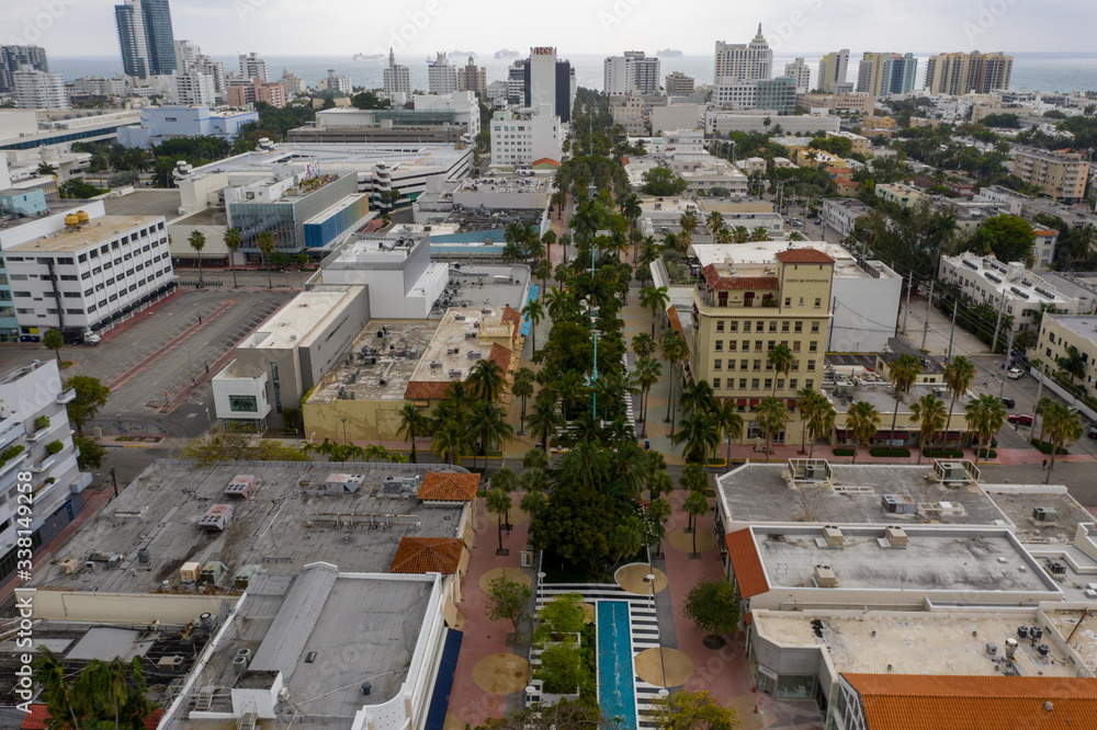 Miami Beach Lincoln Road shops closed observing social distancing order by president Trump shot with drone