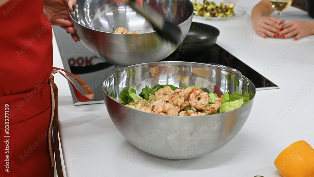 the cook is cooking langoustines. cook in the kitchen. wild shrimp.
