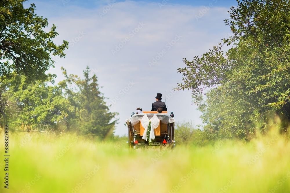 Horse carriage wedding in garden, Great Britain Newly-wed couple in a black, horse-drawn, open carriage Beautiful sunny day