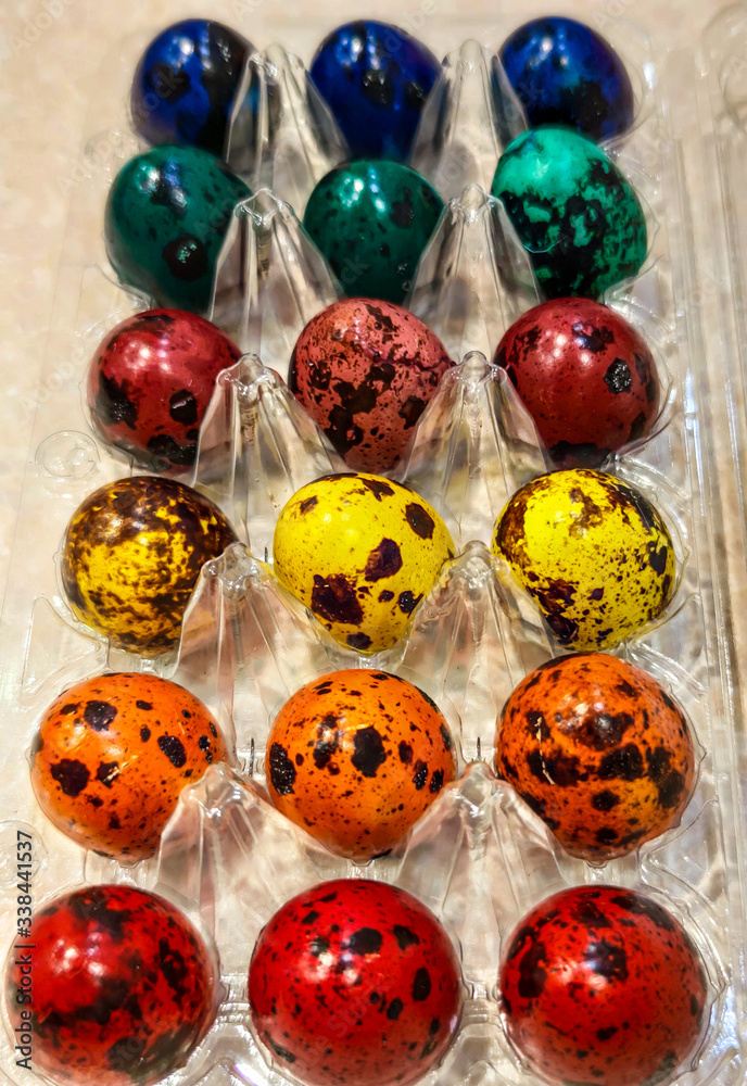 Religious Easter holiday, packaging with spotted quail eggs painted in different colors, colorful rows, red, orange and other colors.