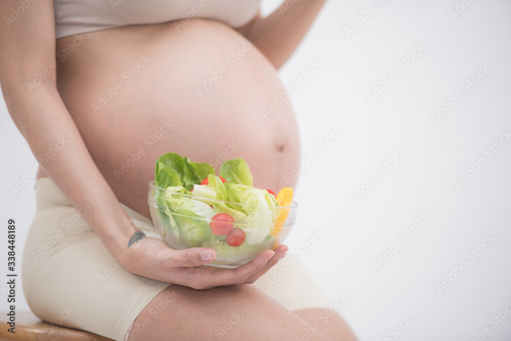 care about unborn child. pregnancy, healthy food and people concept, happy pregnant woman eating vegetable salad for breakfast at home. pregnancy and healthy organic nutrition. healthy natural food.