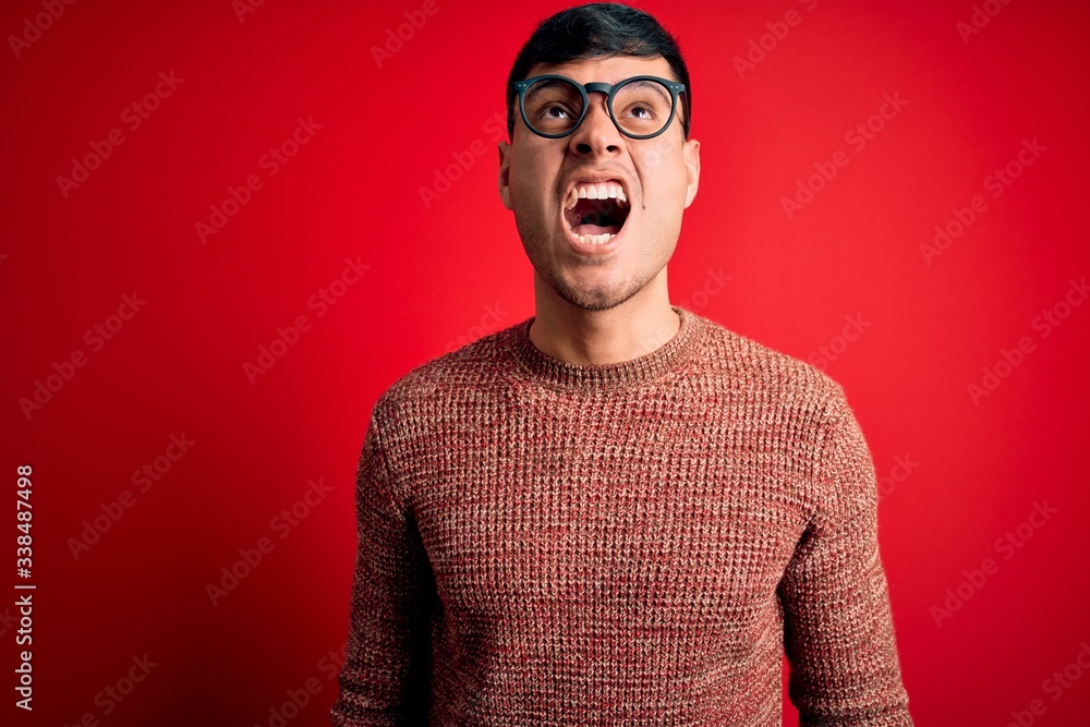 Young handsome hispanic man wearing nerd glasses over red background angry and mad screaming frustrated and furious, shouting with anger. Rage and aggressive concept.