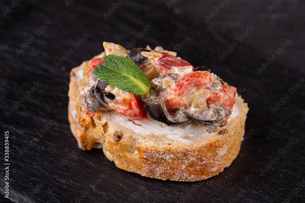 Assorty canape of toast with fish, meat and vegetables on a black background