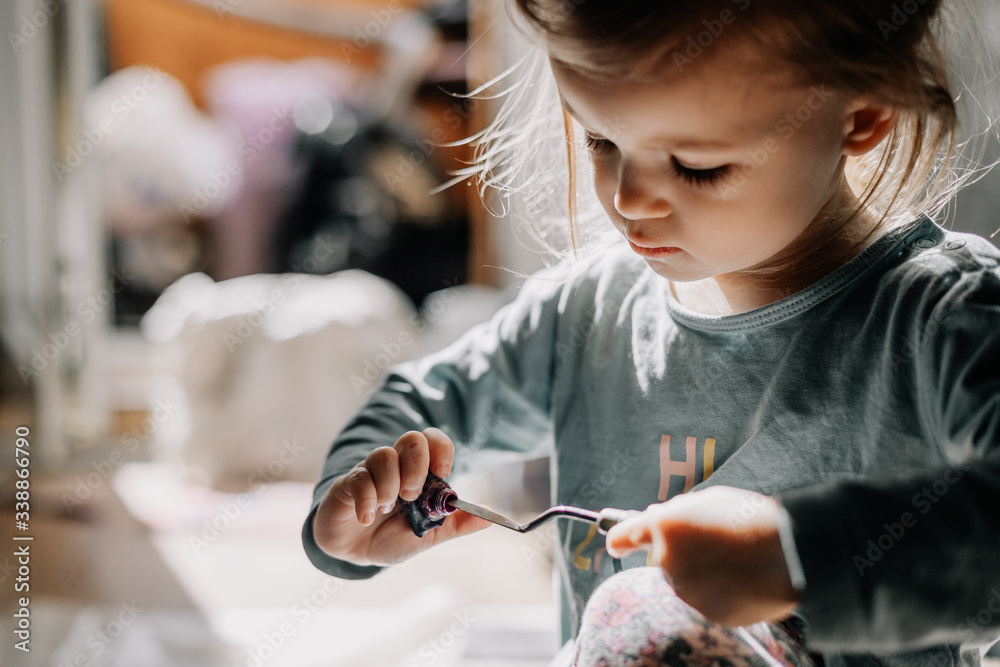 little girl draws oil paints on canvas with bone and palette knife sitting on floor near window