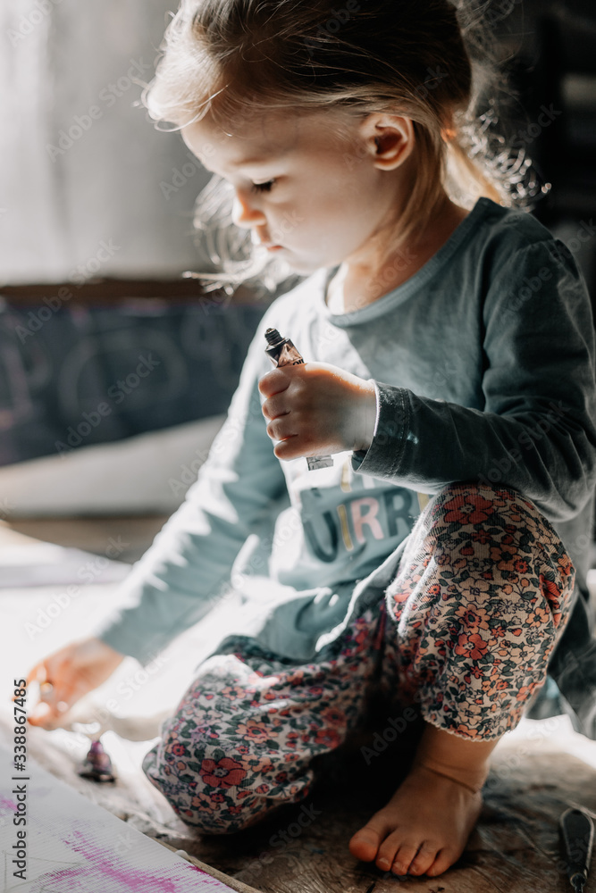 25.06.2018 Vinnitsa, Ukrane: little girl draws oil paints on canvas with bone and palette knife sitting on floor near window
