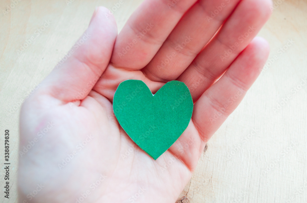 Hand holds a green heart. Life style. Healthy eating. Love of nature. Jealous heart. Relationship problems. Hope. St.Patrick 's Day.