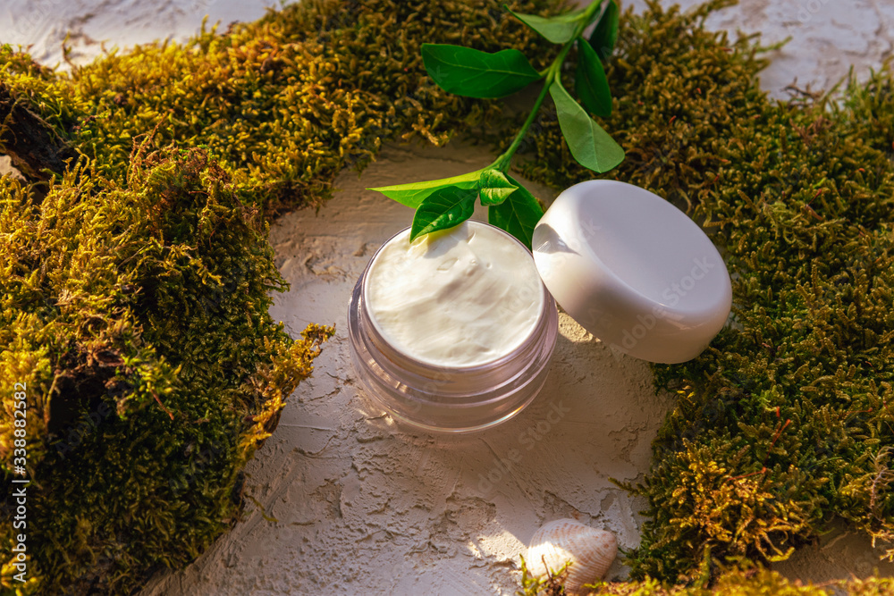 Moisturizing cream jar on the background with moss and greenery. Natural organic cosmetics concept, top view