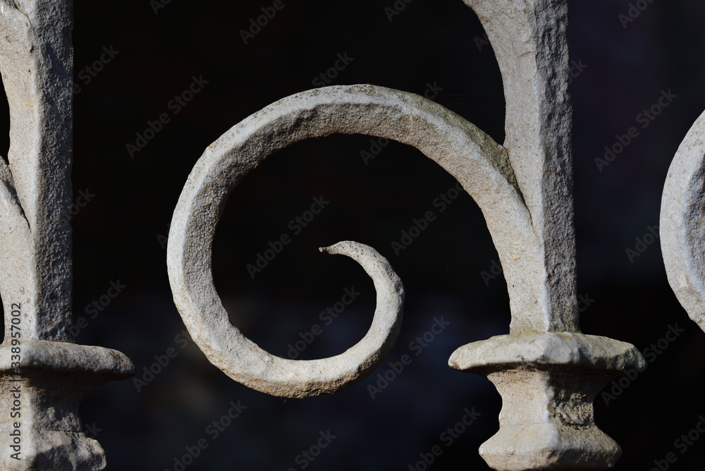Detail of an iron historical grille with a decorative spiral in the middle