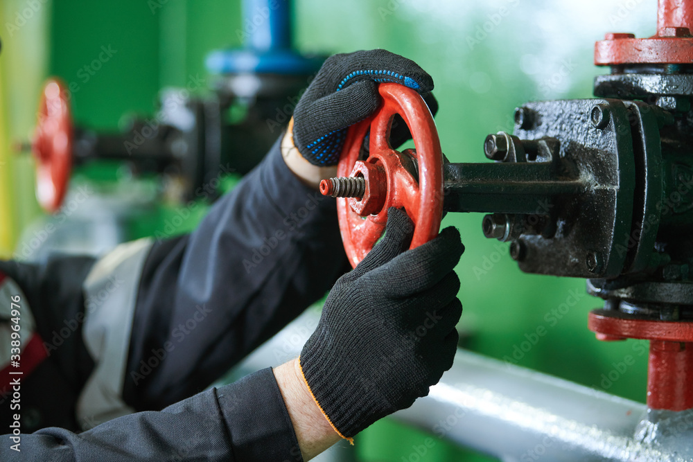 Industrial oil service and mantenance. industrial worker open valve on pipeline at oil factory