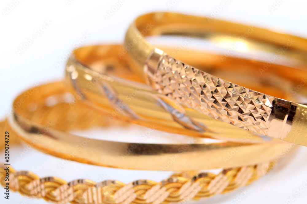 various gold bracelets on a white background
