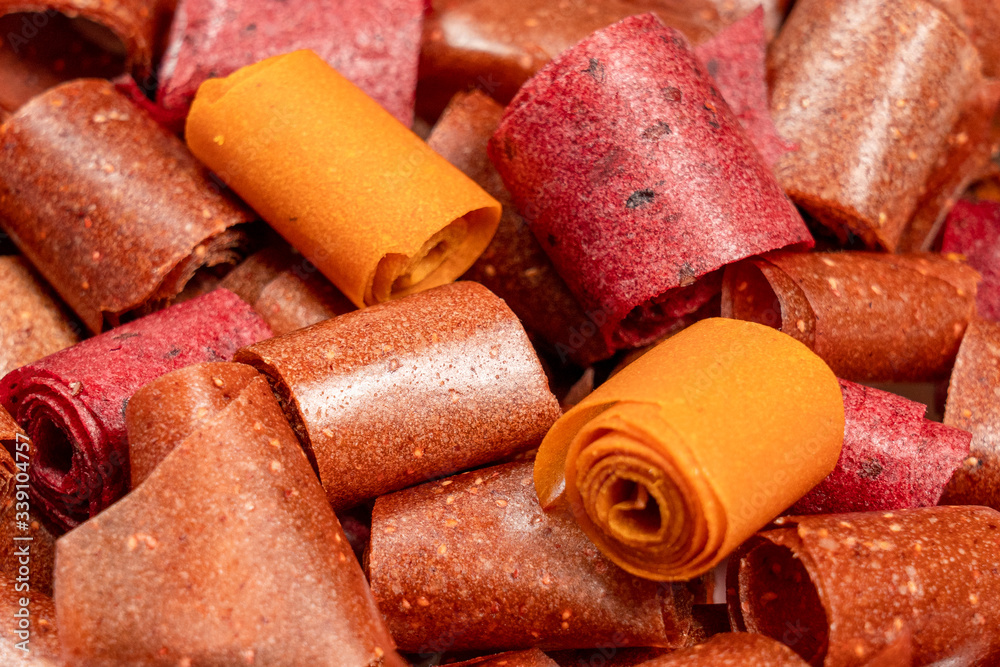 Closeup top view photography of tasty healthy homemade organic dessert made of different kinds of fruits. Rolls of dried fruit leather perfect for eating as healthy snack.