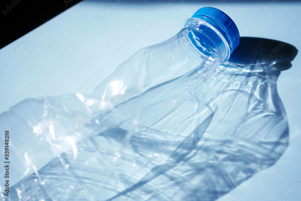 Transparent empty plastic bottle for ecological recycled backlit by bright sunlight on a colored blue background