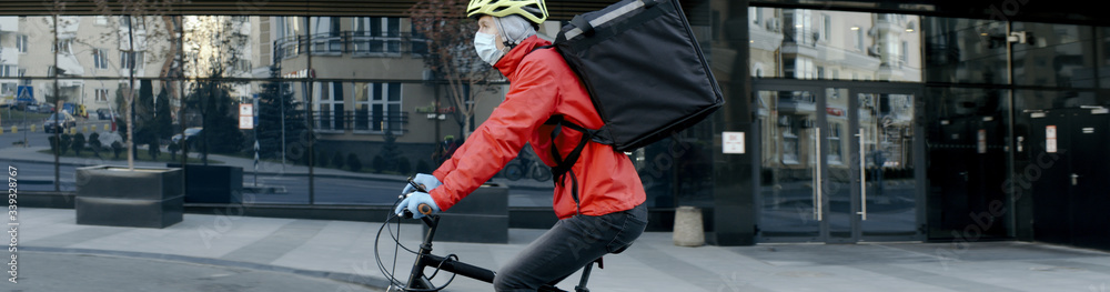 Courier wearing medical mask and gloves riding a bicycle to deliver food order to customers during virus outbreak. Coronavirus, COVID-19, safe delivery