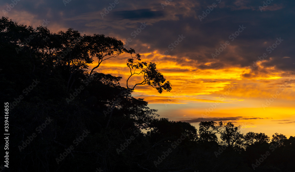 Panorama of an Amazon rainforest sunset with the silhouette of the tree canopy, Yasuni national park, Ecuador.