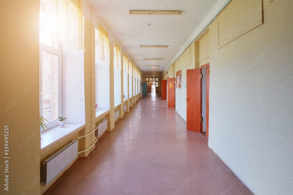 An empty school corridor stretching into the future. The concept of holidays, quarantine, evacuation