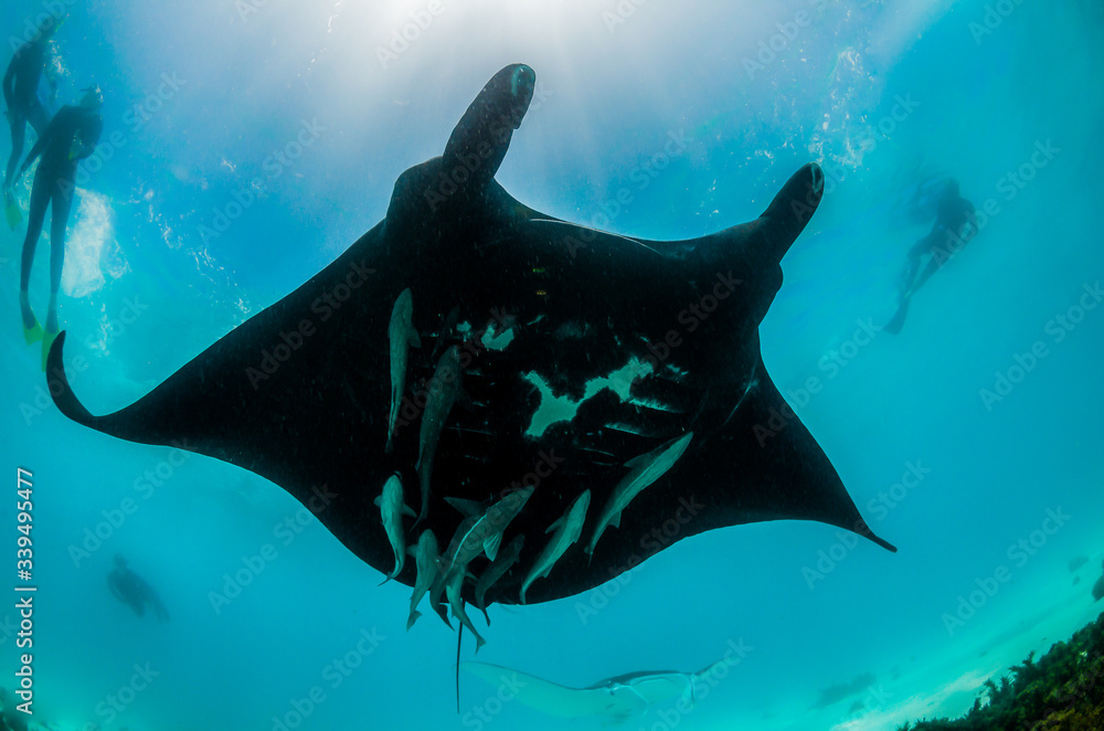 Huge black manta ray swimming in the wild with snorkelers observing from the surface