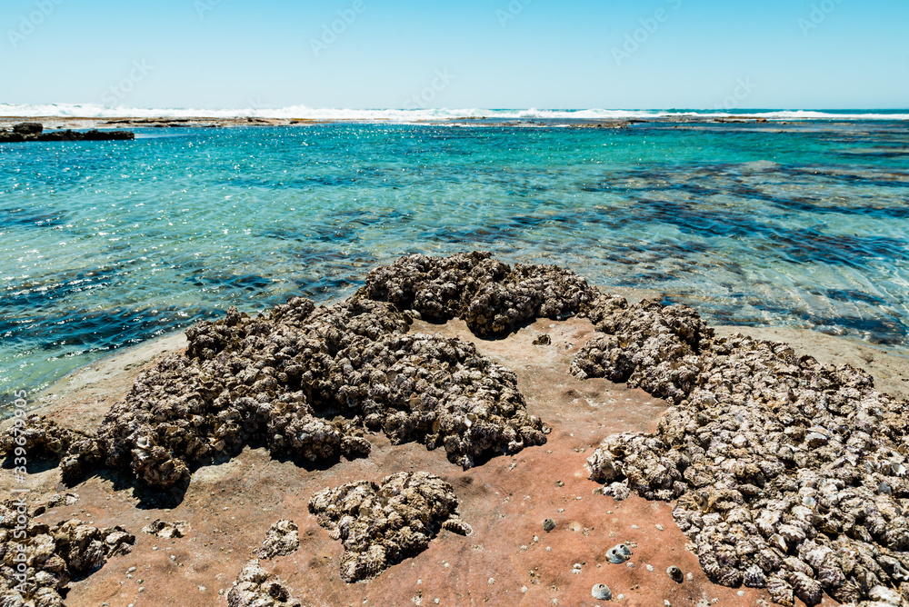 Blue Holes Beach, Kalbarri National Park, Western Australia. Clear turquoise waters of the ocean and coastal limestone coral reef. Scenic snorkelling destination near town of Kalbarri